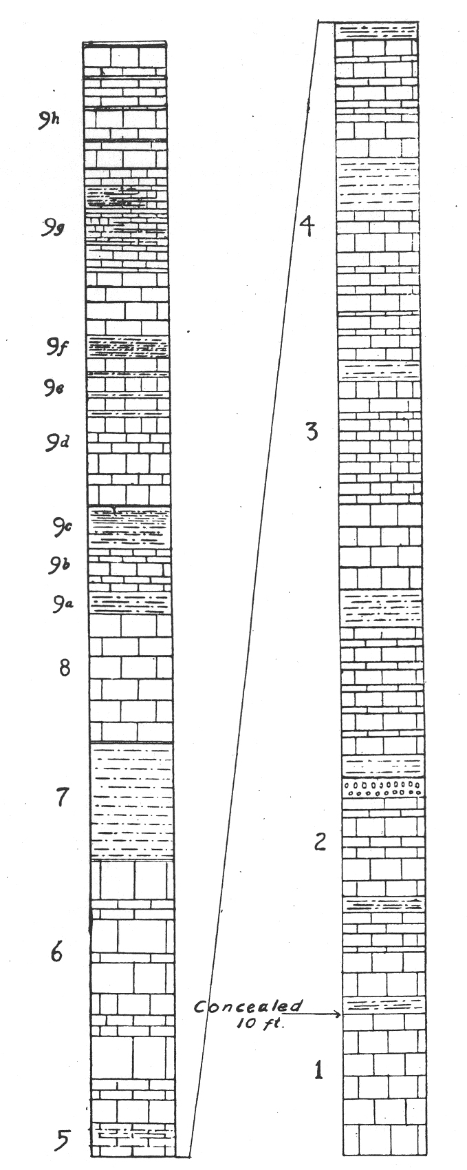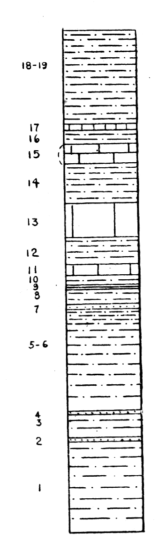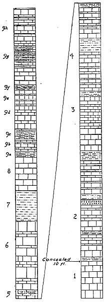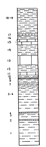 Fig. 1. Columnar section of the Fredericksburg limestone in the valley of the West Fork of the Trinity River near the Lake Worth Dam. The upper half of the section is seen in Plate 1. The numbers refer to corresponding strata described on pp. 29-32. Vertical scale, 1/8 inch=l foot. |